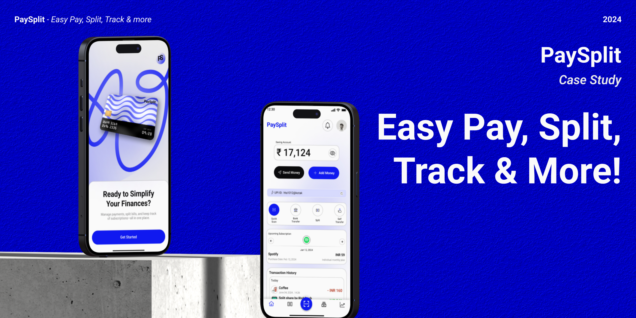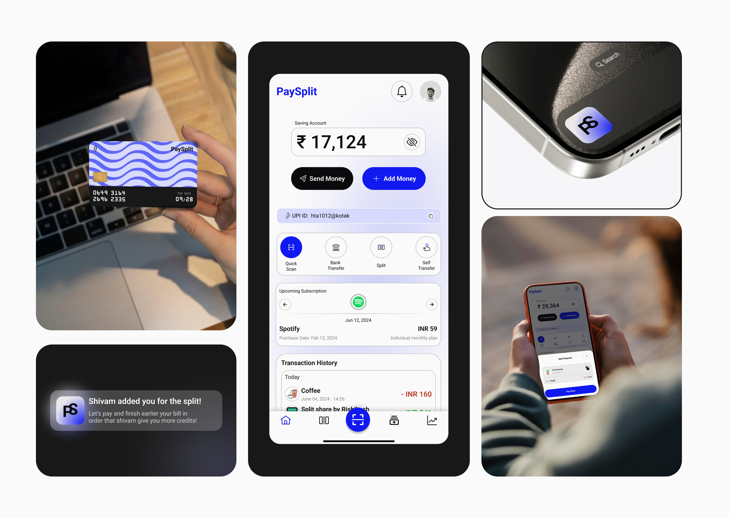 This is a concept banking mobile app design for a Payment app named PaySplit with a modern interactive look. It enables users to pay, scan & split bills. manage subscription and track their transactions in one place.
