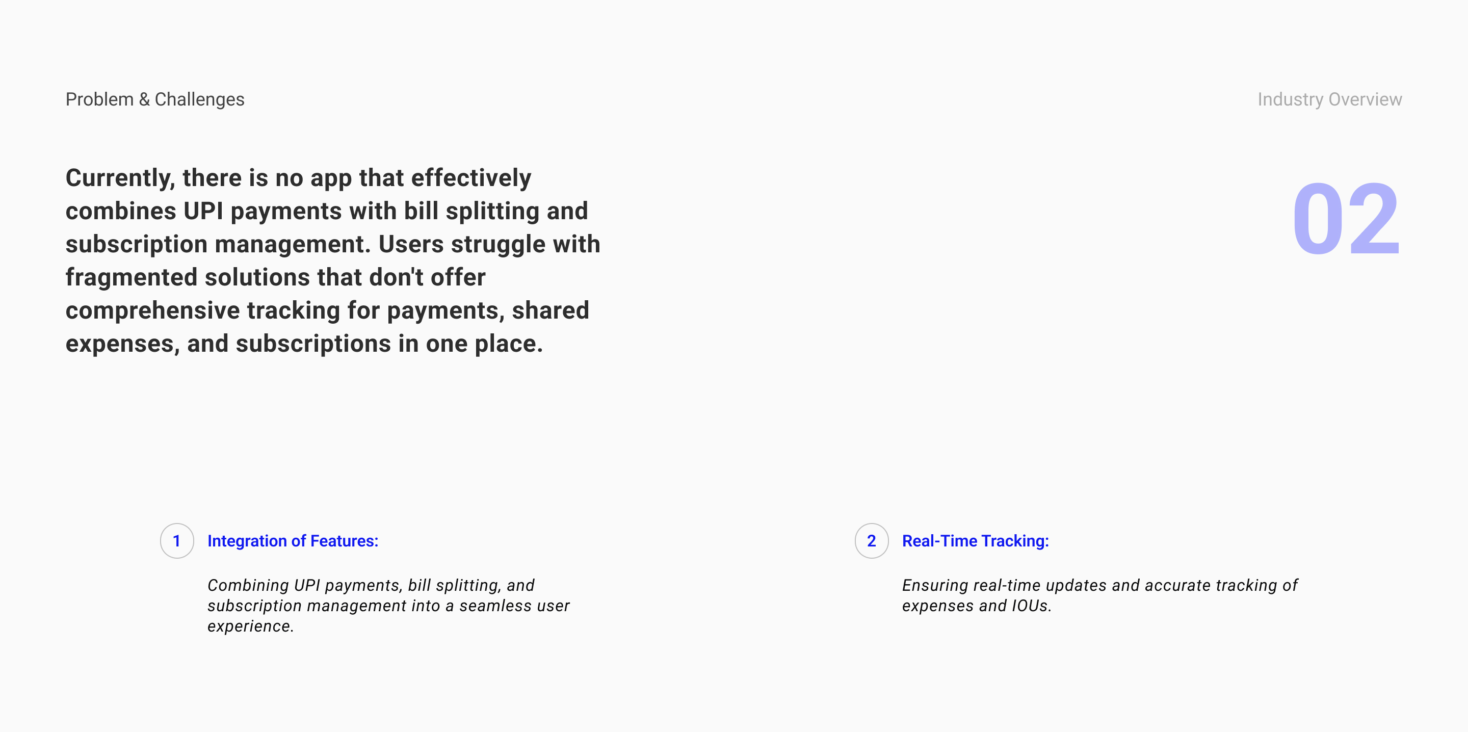 Problem: Currently, there is no app that effectively combines UPI payments with bill splitting and subscription management. Users struggle with fragmented solutions that don't offer comprehensive tracking for payments, shared expenses, and subscriptions in one place.