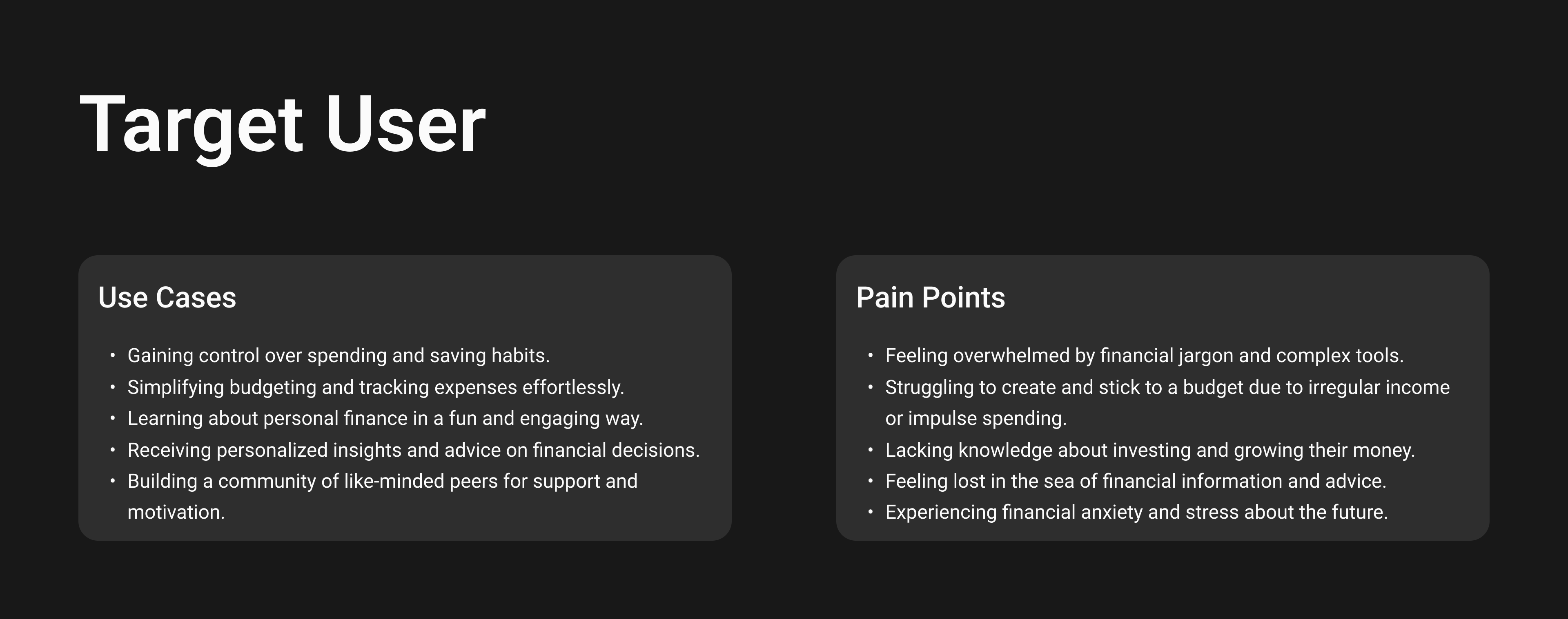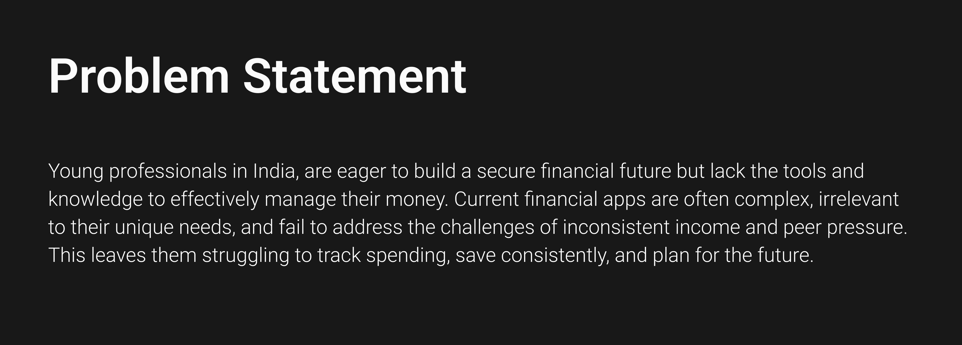 Problem Statement: Young professionals in India, are eager to build a secure financial future but lack the tools and knowledge to effectively manage their money. Current financial apps are often complex, irrelevant to their unique needs, and fail to address the challenges of inconsistent income and peer pressure. This leaves them struggling to track spending, save consistently, and plan for the future.