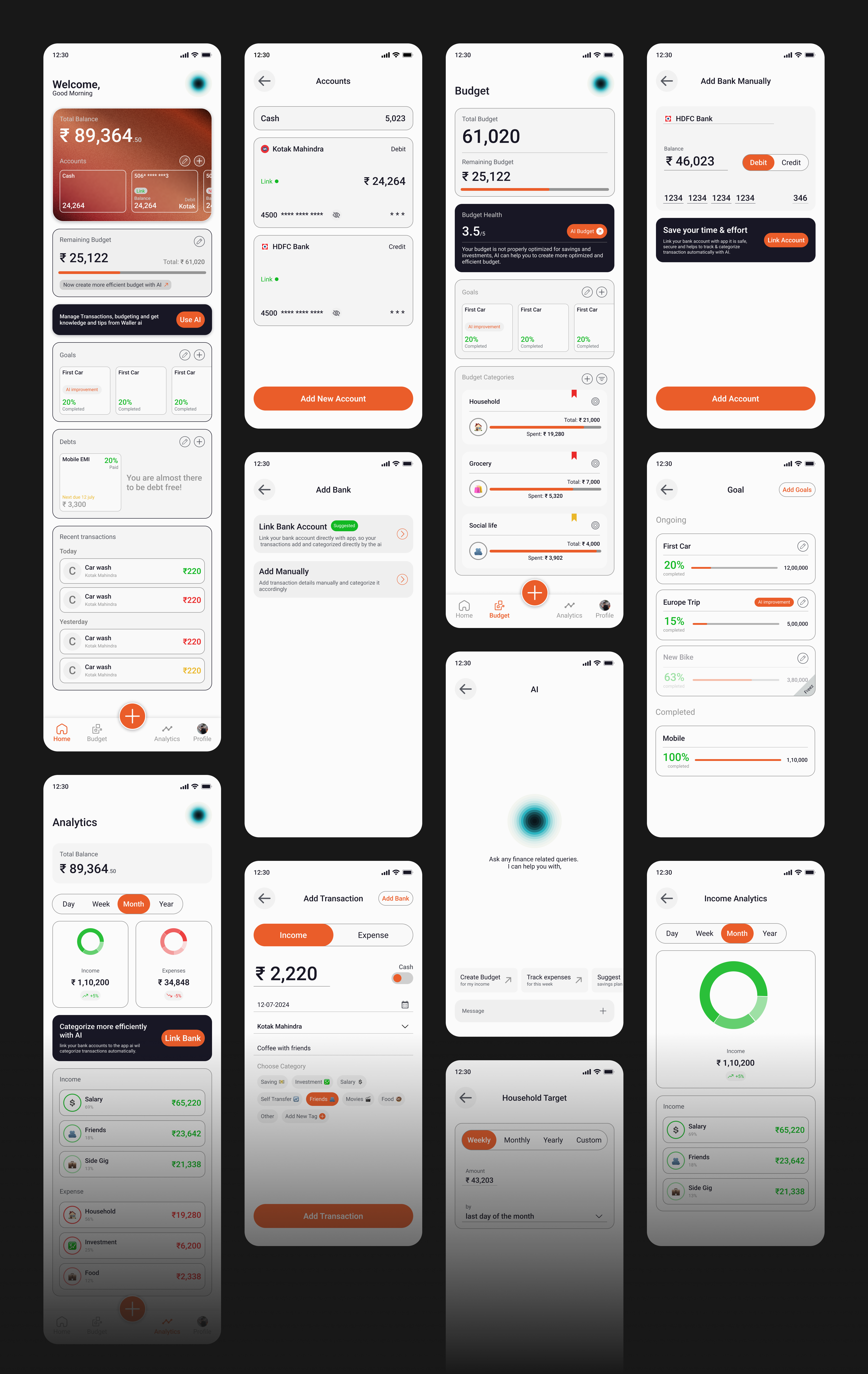This is a concept AI Personal Finance mobile app designed for an Indian youth named Perf AI with a modern interactive look. It enables users to manage and track their expenses category-wise with the help of AI.